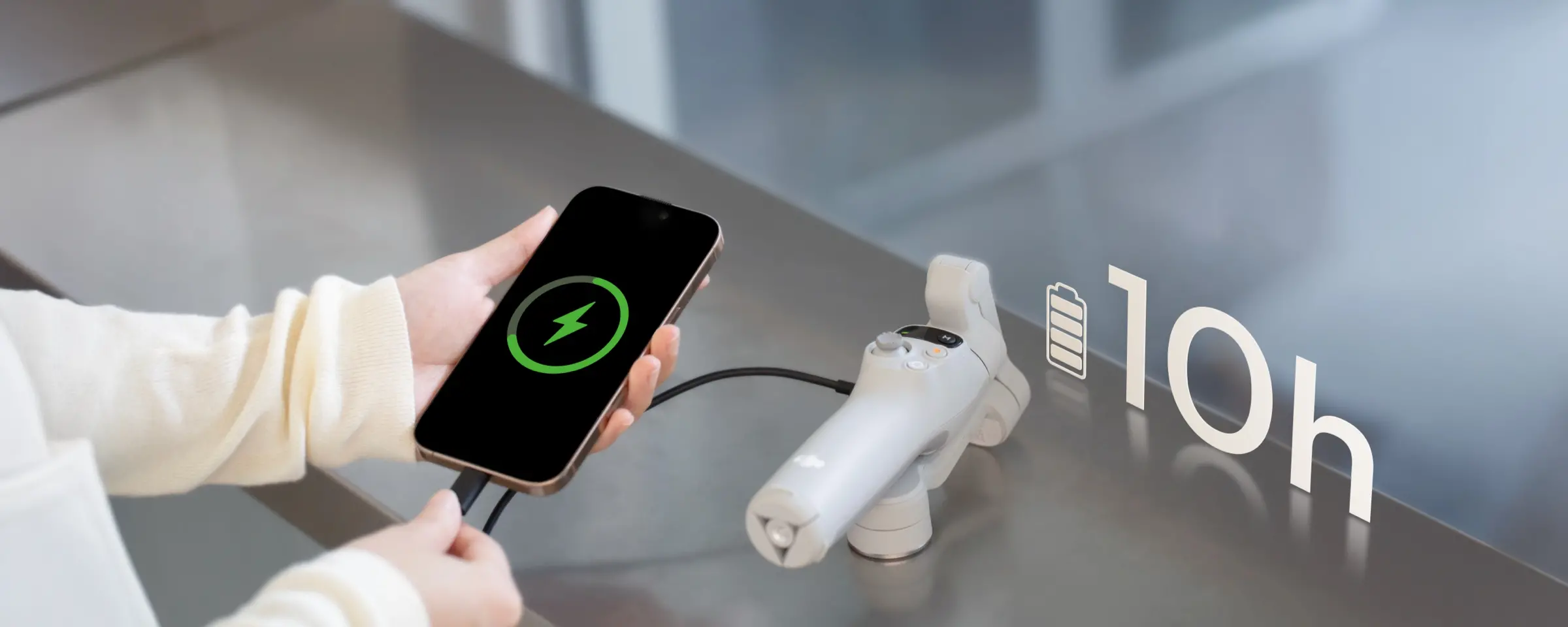 Камера Osmo Mobile 7 Series обеспечивает 10 часов работы[6] и оснащена портом USB-C для зарядки телефона, что идеально подходит для продолжительной съемки на открытом воздухе и прямых трансляций.